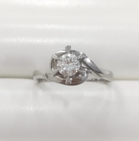 立て爪の指輪から、シンプルなプチネックレスへのリフォームになります。定番の六本爪のデザインが一番シンプルで人気があります。指輪のプラチナの枠は買取りさせて頂き、リフォーム代金から引かせて頂きます。もちろんお客様のダイヤモンドを使用しますので、重さ(ct)の刻印も必ず入れさせて頂きます。